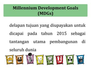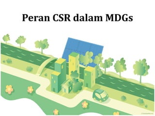 Dokumen ini membahas peran Corporate Social Responsibility (CSR) dalam mencapai Millenium Development Goals (MDGs) dengan fokus pada delapan tujuan yang harus dicapai pada tahun 2015. Meskipun ada kemajuan dalam beberapa target, terdapat hambatan seperti kurangnya pemahaman pemerintah daerah dan rendahnya akses masyarakat terhadap pelayanan kesehatan. CSR diharapkan dapat membantu mempercepat pencapaian MDGs dengan memberdayakan masyarakat dan menyelaraskan program dengan kebutuhan komunitas.