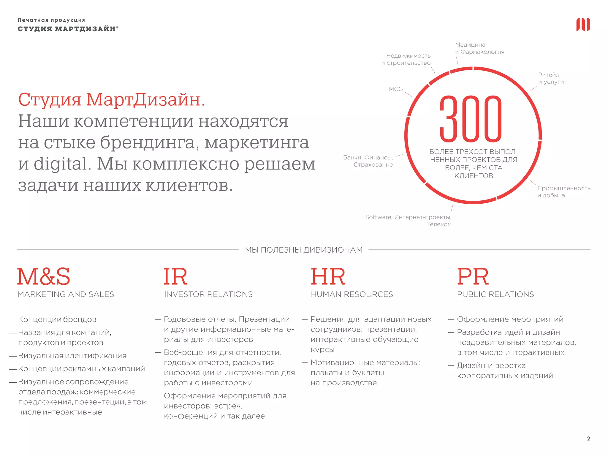 Студия мартдизайн® предлагает комплексные решения в области брендинга, маркетинга и digital, осуществив более 300 проектов для различных секторов экономики. В их портфолио представлены сайты, печатная продукция, а также материалы для инвесторов и сотрудников. Основные преимущества компании — индивидуальный подход, длительный срок эксплуатации решений и использование собственных технологий.