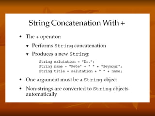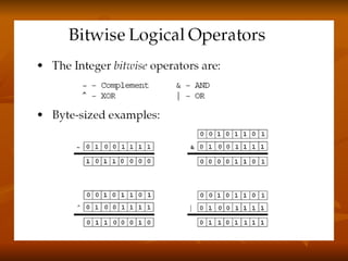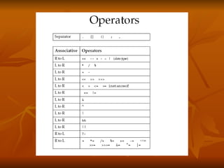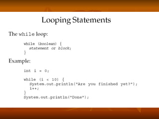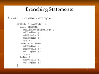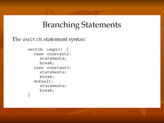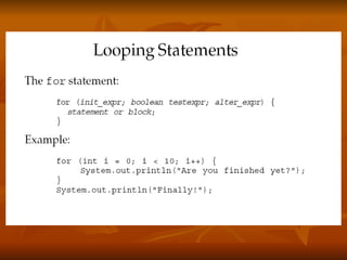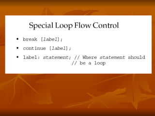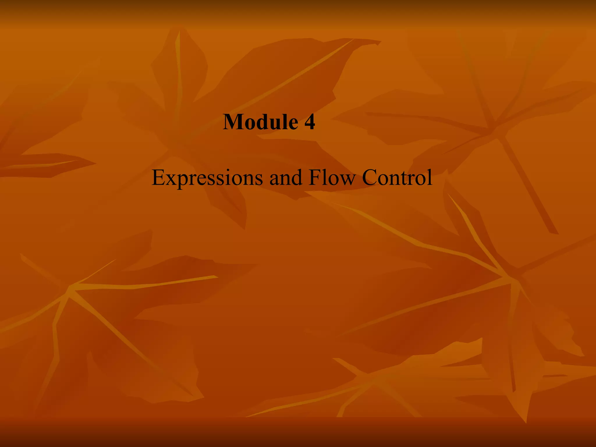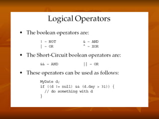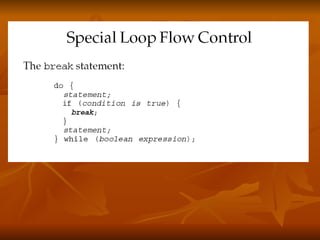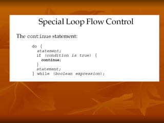 The document covers key concepts in Java expressions and flow control including: