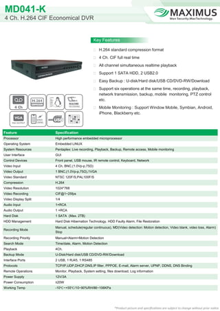 This document provides specifications for an MD041-K 4 channel H.264 CIF DVR. It supports recording and simultaneous playback of 4 video channels in CIF resolution at 1-25 frames per second. It has features like H.264 compression, support for 1 SATA HDD and 2 USB ports, backup to USB/HDD/CD/DVD, and mobile monitoring on various platforms. The DVR has a high performance embedded processor, embedded Linux OS, and supports functions like recording, playback, backup, remote access and mobile monitoring simultaneously.