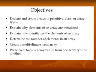 The document discusses Java arrays, including how to declare, construct, initialize, access elements of, and get the size of arrays. It explains that arrays are ordered collections of primitive types or object references that hold multiple values of the same type. The document also covers array bounds, resizing arrays, and provides examples of using arrays.