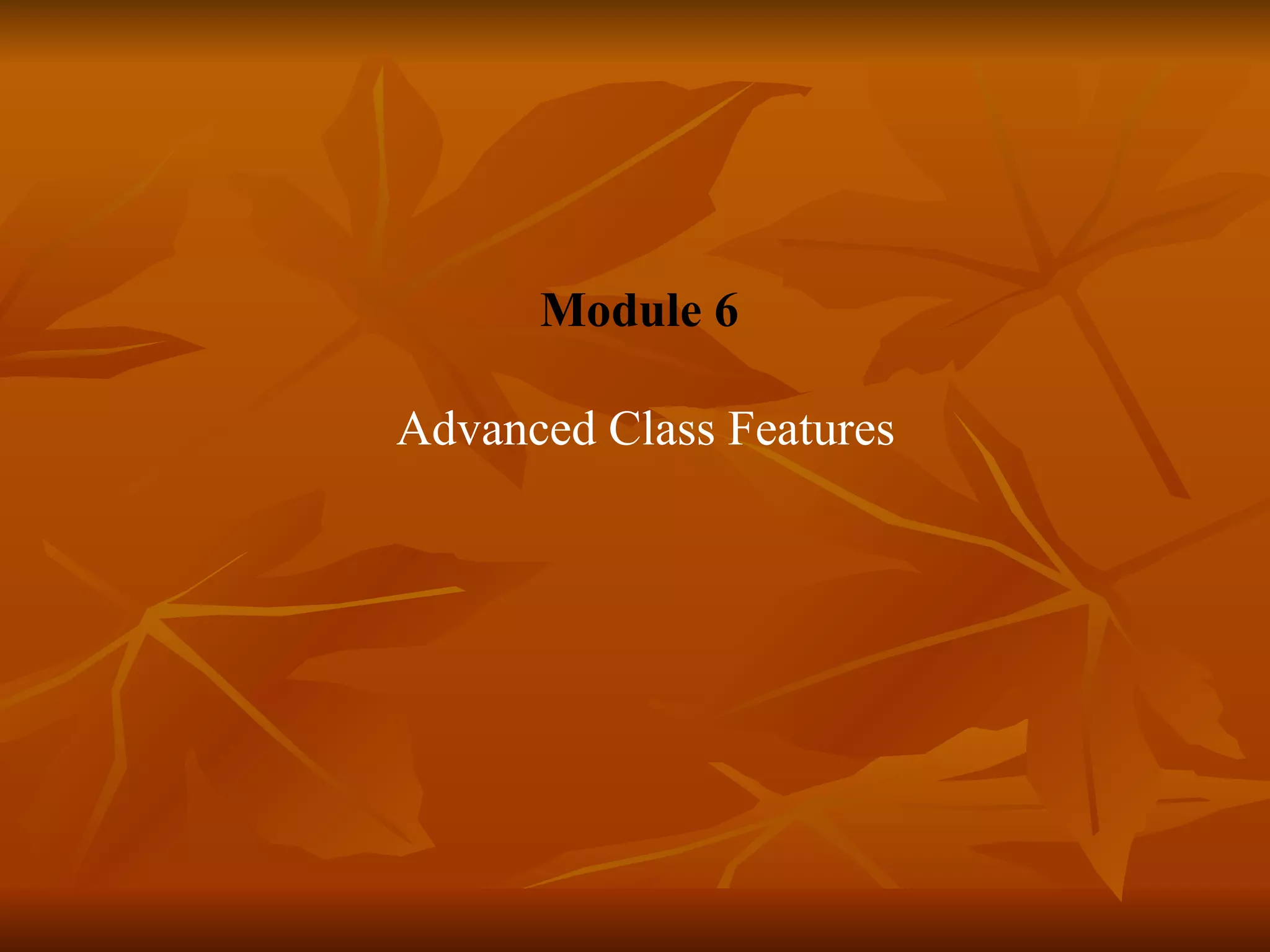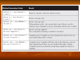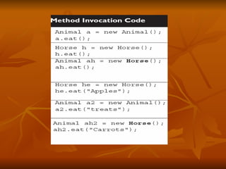 The document provides an overview of advanced class features in Java, including method overloading, overriding, and constructors. It discusses the differences between overloaded and overridden methods, and how to call parent class methods using super. It also covers enumerations, wrapper classes, autoboxing/unboxing, annotations, and inner classes.