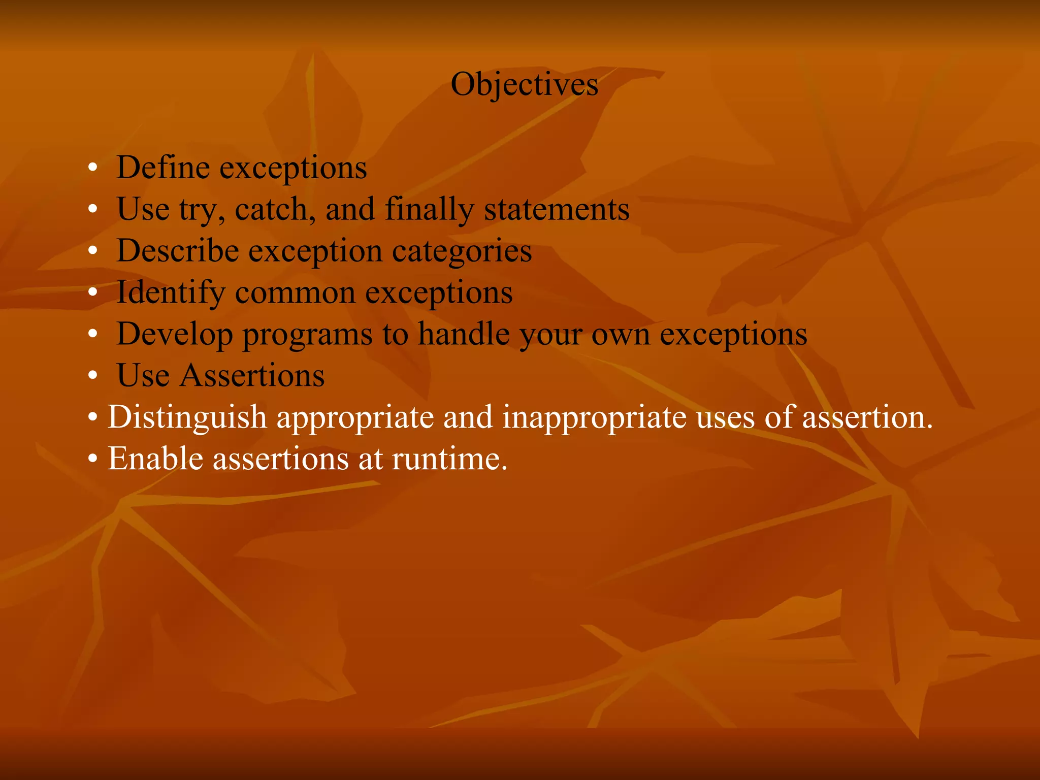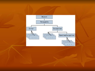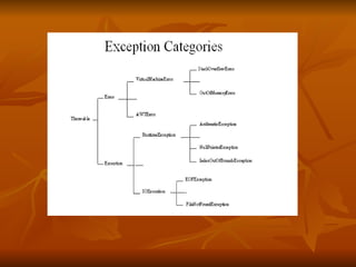 This document discusses exceptions and assertions in Java, including defining exceptions, using try/catch/finally statements, built-in exception categories, and developing programs to handle custom exceptions. It also covers appropriate uses of assertions such as validating internal invariants, control flow assumptions, and pre/postconditions. The document provides examples of throwing, catching, and propagating exceptions as well as enabling and using assertions in code.
