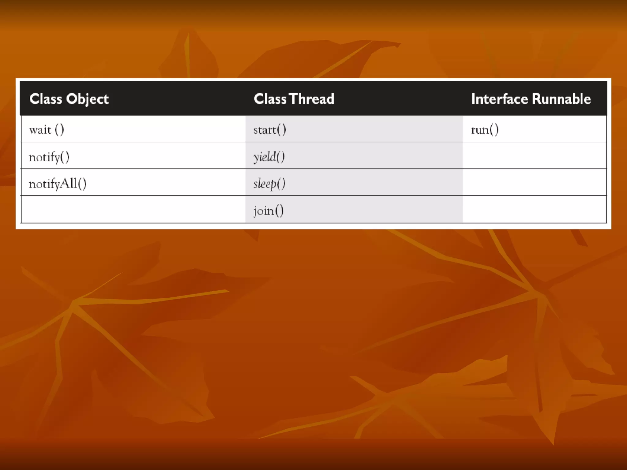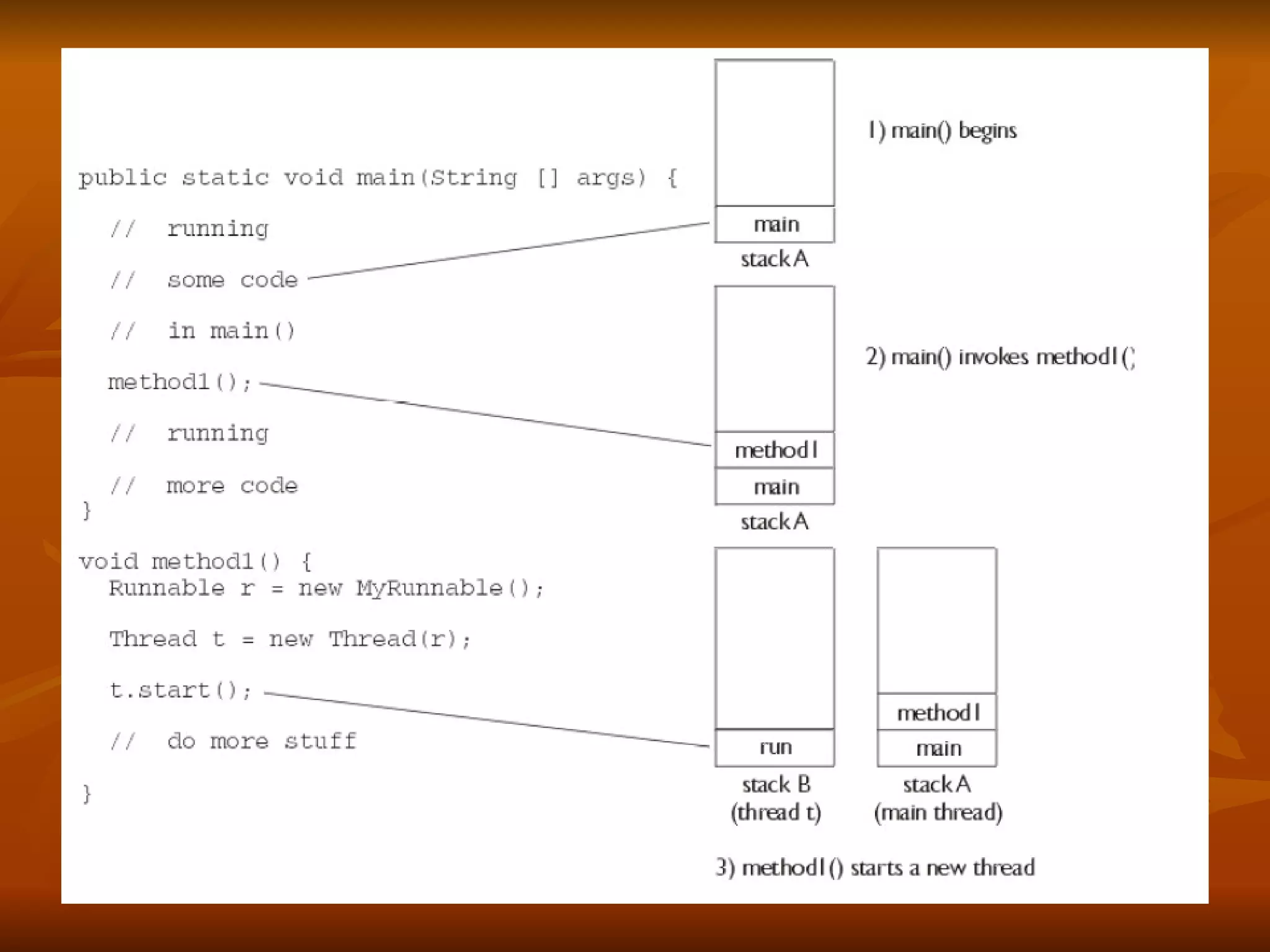 Not Runnable toRunnable Exit for every entrance to Not Runnable state If the thread is put to sleep , the specified number of milliseconds must elapse. If the thread is waiting for a condition,then another object must notify the waiting thread of a change in condition by calling notify or notifyAll. If the thread is blocked on I/O, the I/O must complete. Stop Thread stops when the run method terminates.