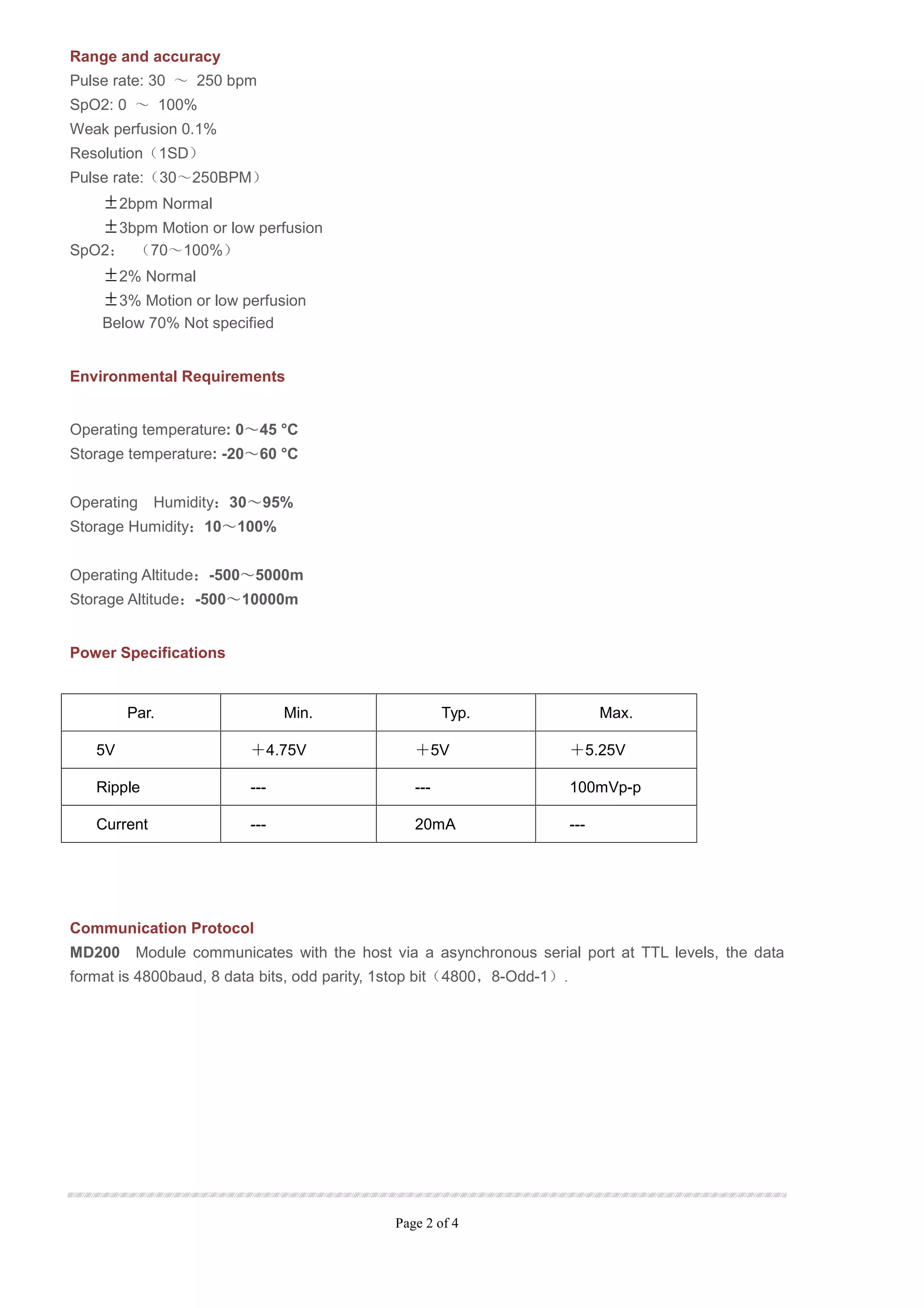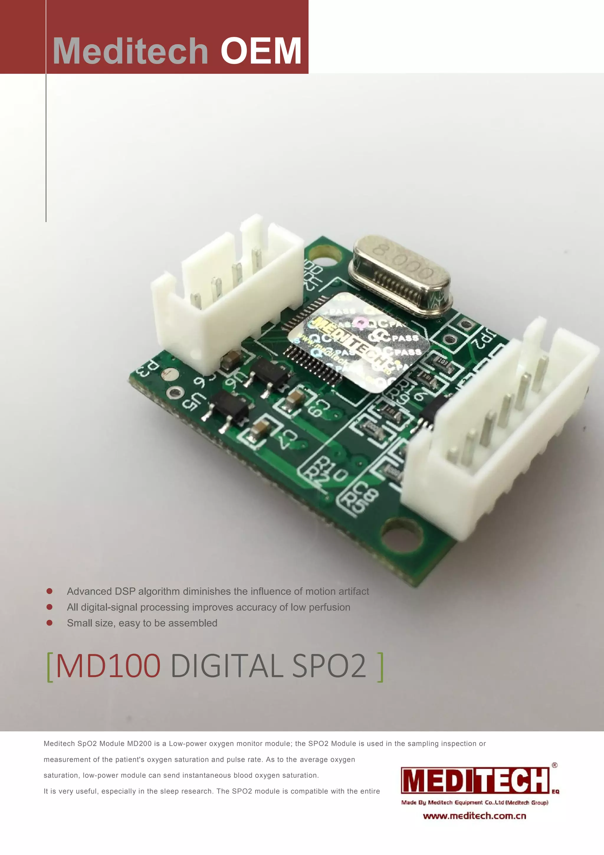 The document describes the Meditech MD200 digital SpO2 module, which is a low-power device used to monitor oxygen saturation and pulse rate, particularly useful in sleep research. It features advanced DSP algorithms to reduce motion artifact and improve accuracy in low perfusion conditions, with operational specifications including a temperature range of 0-45°C and humidity of 30-95%. The module communicates via a TTL asynchronous serial port, supporting a pulse rate range of 30-250 bpm and SpO2 levels of 0-100% with specific accuracy metrics.