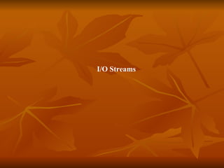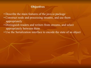 The document discusses Java I/O streams, which allow programs to read and write data. It describes the different types of streams for reading bytes and characters from sources like files, pipes, and memory. It also covers serialization which allows objects to save their state to a byte stream that can later be used to recreate the object.