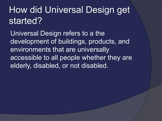 This document discusses Universal Design for Learning (UDL), which seeks to make the learning process adaptable for all people regardless of their abilities or needs. It originated from architectural designs that made buildings universally accessible. UDL principles give all individuals equal opportunities to learn through flexible methods, materials and assessments. Research shows the brain has three networks (recognition, strategic, and affective) that impact learning in different ways. UDL uses diverse tools and flexibility to support these different networks. Advancing technology is also helping to support UDL through tools like speech-to-text.