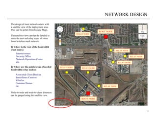 The document provides guidance on designing a wireless mesh network. It discusses beginning the design process with a satellite view of the deployment area to identify the root and relay nodes. Node locations are influenced by factors like the start and end points of bandwidth, points of needed bandwidth, and limitations of antennas and mounting locations. The document also provides information on estimating node ranges using a link budget calculator and selecting appropriate antennas based on the type of deployment, such as urban, rural, harbor, campground or mining scenarios. Recommendations are given for antenna selection and channel usage to avoid signal overlap.