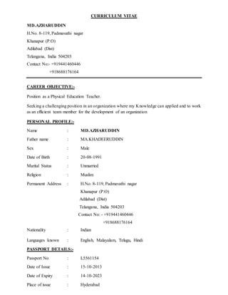 Md. Azharuddin is seeking a position as a Physical Education Teacher. He has a Bachelor of Physical Education degree from Amaravathi University and a Bachelor of Commerce and Computers degree from Kakatiya University. He has over 1 year of experience as an Outpatient Executive at Yashoda Hospital in Hyderabad and is currently working as a Resident Physical Trainer at Edusports in Hyderabad. He has participated in national level cycling competitions and has computer skills in MS Office, desktop publishing, AutoCAD 2D, and civil drafting.