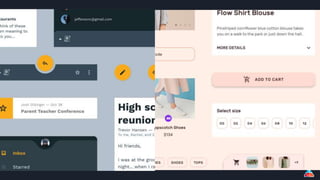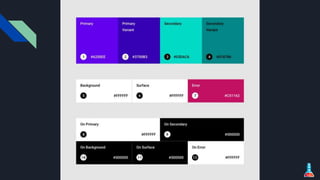The document discusses material design components for Android, iOS, and web applications, emphasizing various customizable UI elements such as buttons, text fields, bottom navigation bars, and snackbars. It elaborates on the features of each component, including their styles and uses, particularly in enhancing user interaction and visual engagement. Additionally, it covers material theming, which allows developers to customize color, typography, and shape attributes to align with their brand.