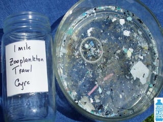 The document discusses the issue of plastic pollution and its impacts. It notes that plastic production and usage increased dramatically starting in the 1950s. Vast amounts of plastic end up polluting oceans, with the Great Pacific Garbage Patch being twice the size of Texas. Marine life is negatively impacted through ingestion and entanglement. Plastics also absorb and leach toxic chemicals that can impact human and environmental health. Solutions discussed include reducing single-use plastic usage through bring-your-own alternatives, cleaning up beaches, advocacy, and enacting extended producer responsibility legislation.