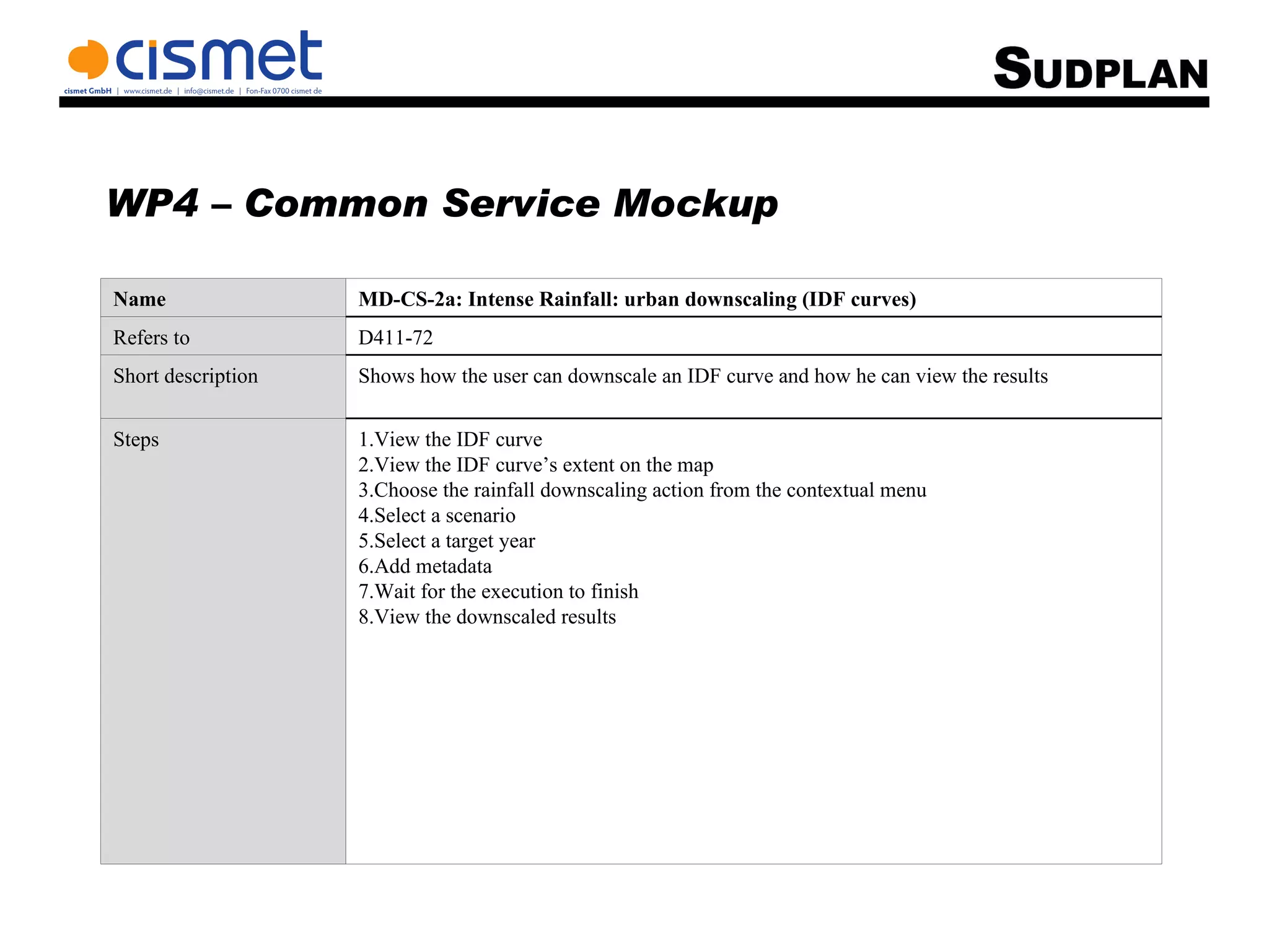 This document outlines 8 steps for downscaling an intensity-duration-frequency (IDF) curve in a common service mockup: 1) view the IDF curve, 2) view its extent on a map, 3) choose downscaling from a menu, 4) select a scenario, 5) select a target year, 6) add metadata, 7) wait for execution, and 8) view downscaled results. The process allows a user to downscale an IDF curve and view the results.