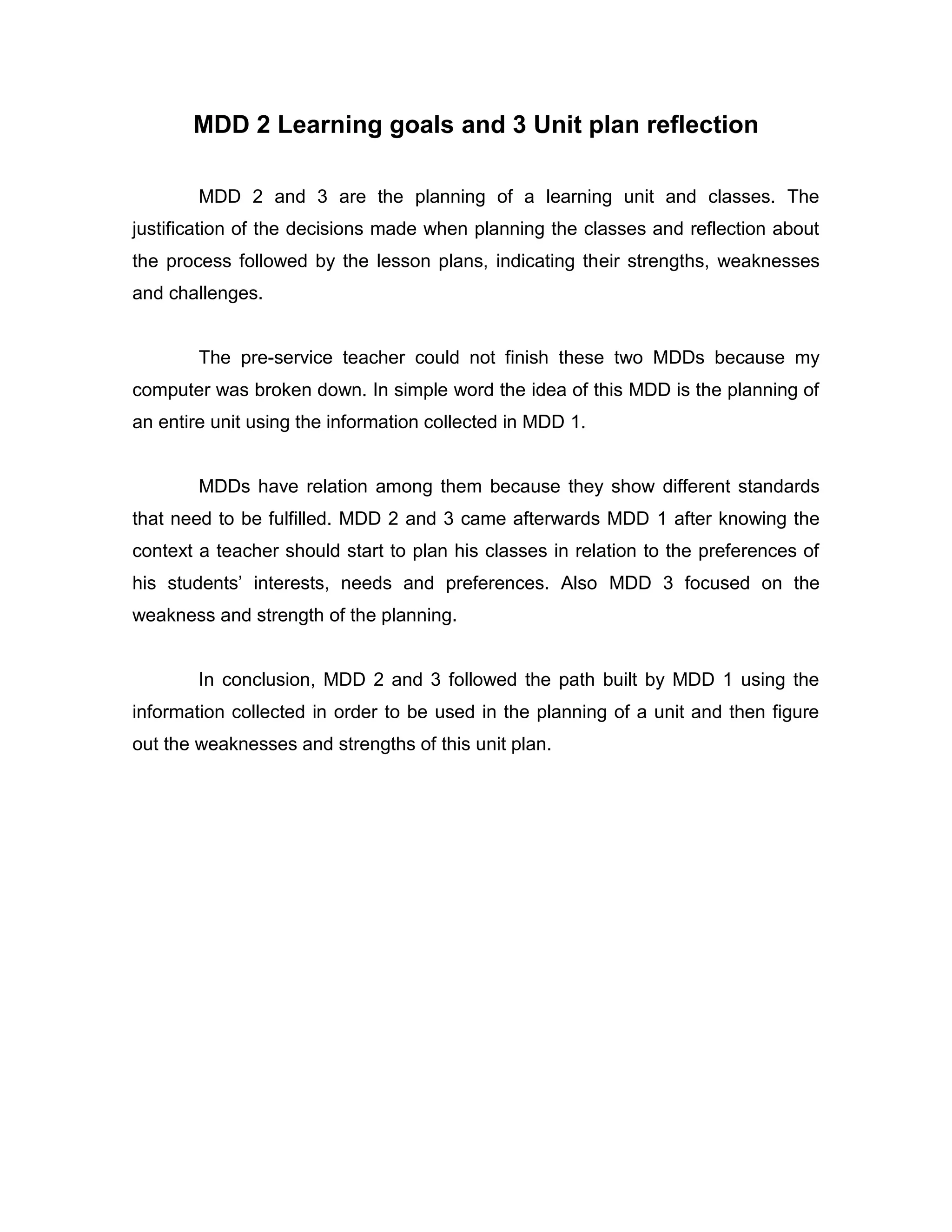 MDD 2 and 3 require pre-service teachers to plan a learning unit and individual class lessons, justifying decisions and reflecting on strengths, weaknesses, and challenges. While the teacher was unable to complete the assignments due to computer issues, MDDs are meant to build upon each other by applying information from the initial context analysis in MDD 1 to lesson planning in MDD 2 and a retrospective evaluation in MDD 3.