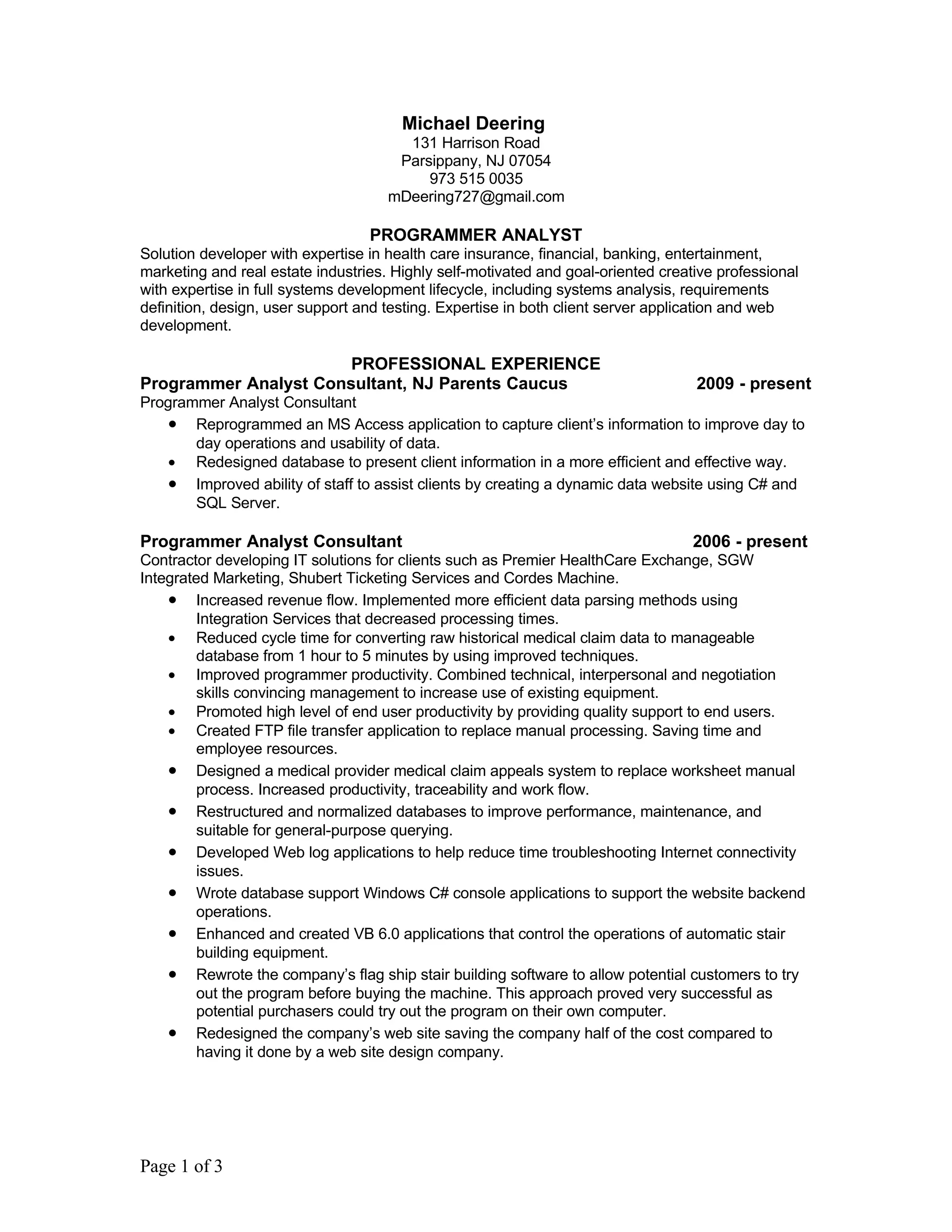Michael Deering is a programmer analyst with over 15 years of experience developing solutions for healthcare, financial, banking, entertainment, marketing and real estate industries. He has expertise in full systems development lifecycle and technologies such as C#, VB.Net, ASP.NET, SQL Server, and SSIS. His experience includes developing applications to improve operations and data management for clients, rewriting legacy systems, and creating reporting and help documentation.