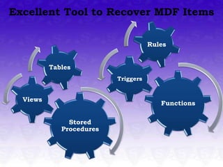 - Recover SQL database constraints, indexes, tables, databases, triggers, views, stored procedures and other elements from damaged MDF files.