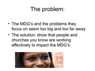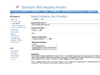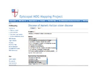 The document discusses a mapping project to connect local Episcopal churches with the international places where they are making an impact on the United Nations Millennium Development Goals. The project aims to create maps that link churches' efforts to specific goals in order to raise awareness, understanding, and collaboration. It hopes to show people that the problems addressed by the goals are not too large because churches and individuals they know are already actively working to solve them.