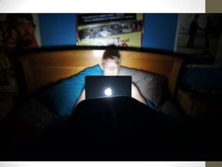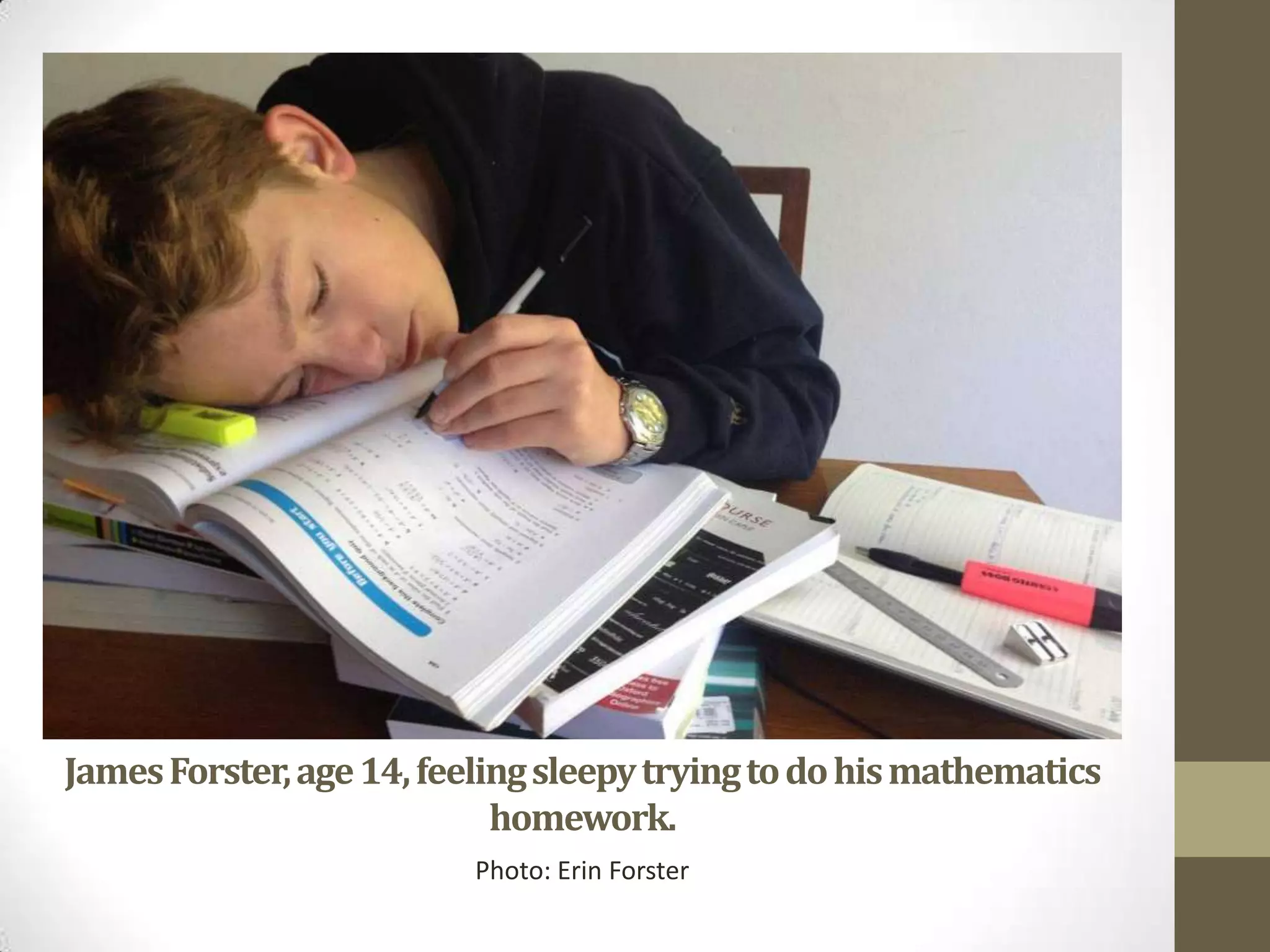 The document discusses several teenagers and their use of technology in the evenings and how it affects their sleep. It describes James Forster feeling sleepy while doing math homework, brothers James and Matt Forster using iPads to study after school, Angelo Rafaraci preferring to study on his bed and still doing homework at 11pm on a school night, and siblings engaging with technology after school. It concludes by suggesting decreasing technology use and supplements to improve sleep quality.