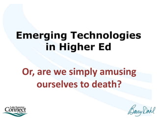 This document discusses emerging technologies in higher education and whether they are simply entertaining students or can be used innovatively. It notes the large increase in online and on-ground enrollment at one college. It then discusses perspectives on whether entertaining or engaging students is the job of faculty through clicker polls. It also discusses definitions of educational technology terms and levels of technology adoption among different demographic groups through additional clicker polls. It raises questions about whether online learning dumb downs education or if technologies are just attempts to be cool. It also discusses challenges like distraction and lack of discipline online as well as the ability to multitask. It concludes that most agree higher education needs significant change to remain relevant in the future.