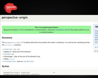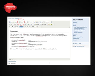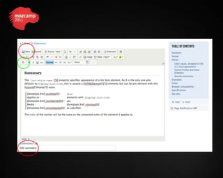 This document discusses Mozilla's MDN (Mozilla Developer Network) documentation platform. It provides an overview of the evolution and goals of the Kuma project, which aims to build a platform for developer engagement and improve documentation processes. The document outlines Kuma's development approach, roadmap, and how readers can get involved with the project by contributing documentation.