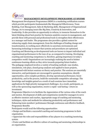 The Management Development Programme at SPJIMR provides certification courses to help participants gain fundamentals like managerial effectiveness, team building, and cost management. It also covers emerging issues like big data, creativity and innovation, and leadership. The pedagogy involves case studies, simulations, and role plays to encourage interactive learning. Participants can apply their new knowledge to address real management challenges and provide rapid returns on investment for themselves and their organizations. The coaching and mentoring programme specifically aims to develop those skills for enhancing employee productivity and performance through continuous feedback. It teaches designing successful coaching programs and fostering a culture of mentoring in organizations.