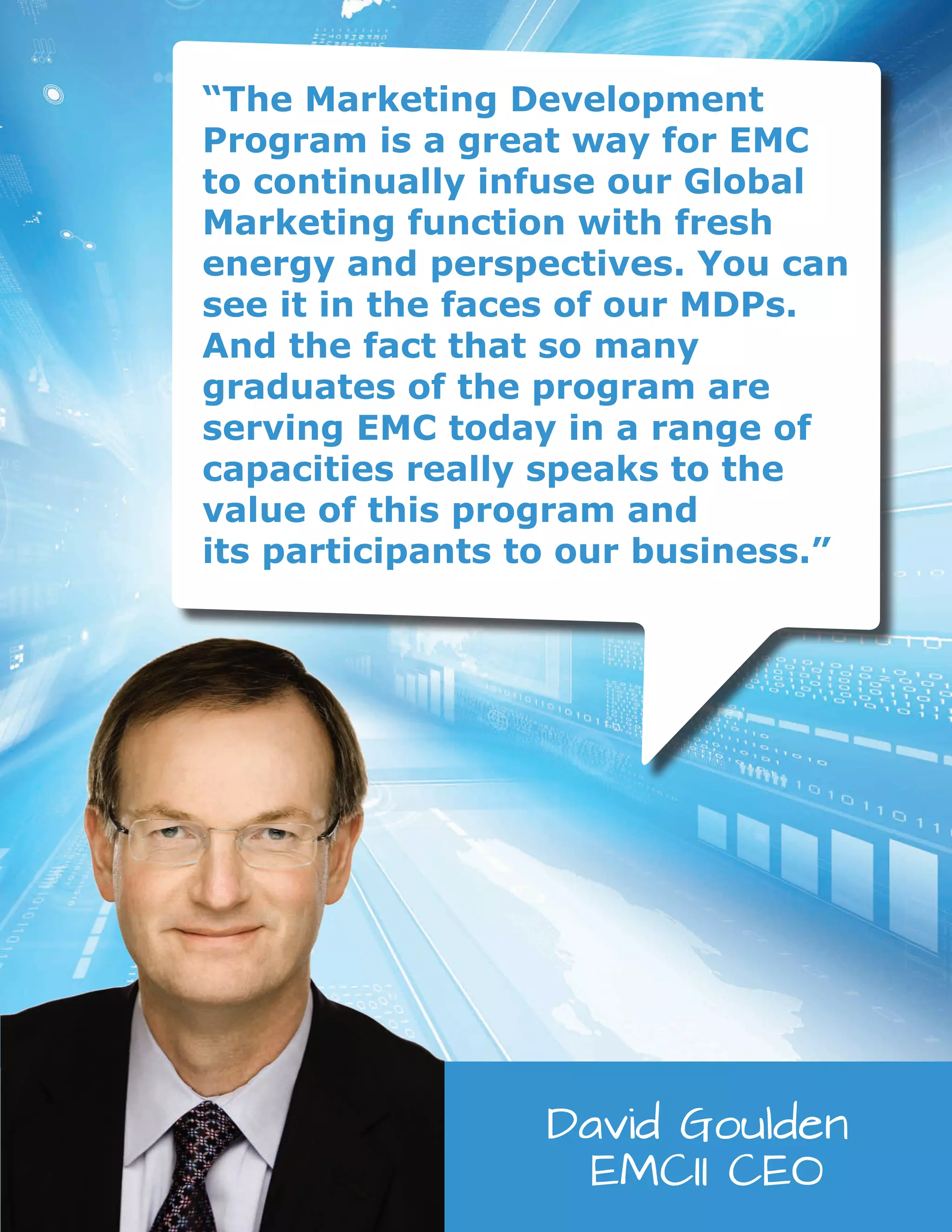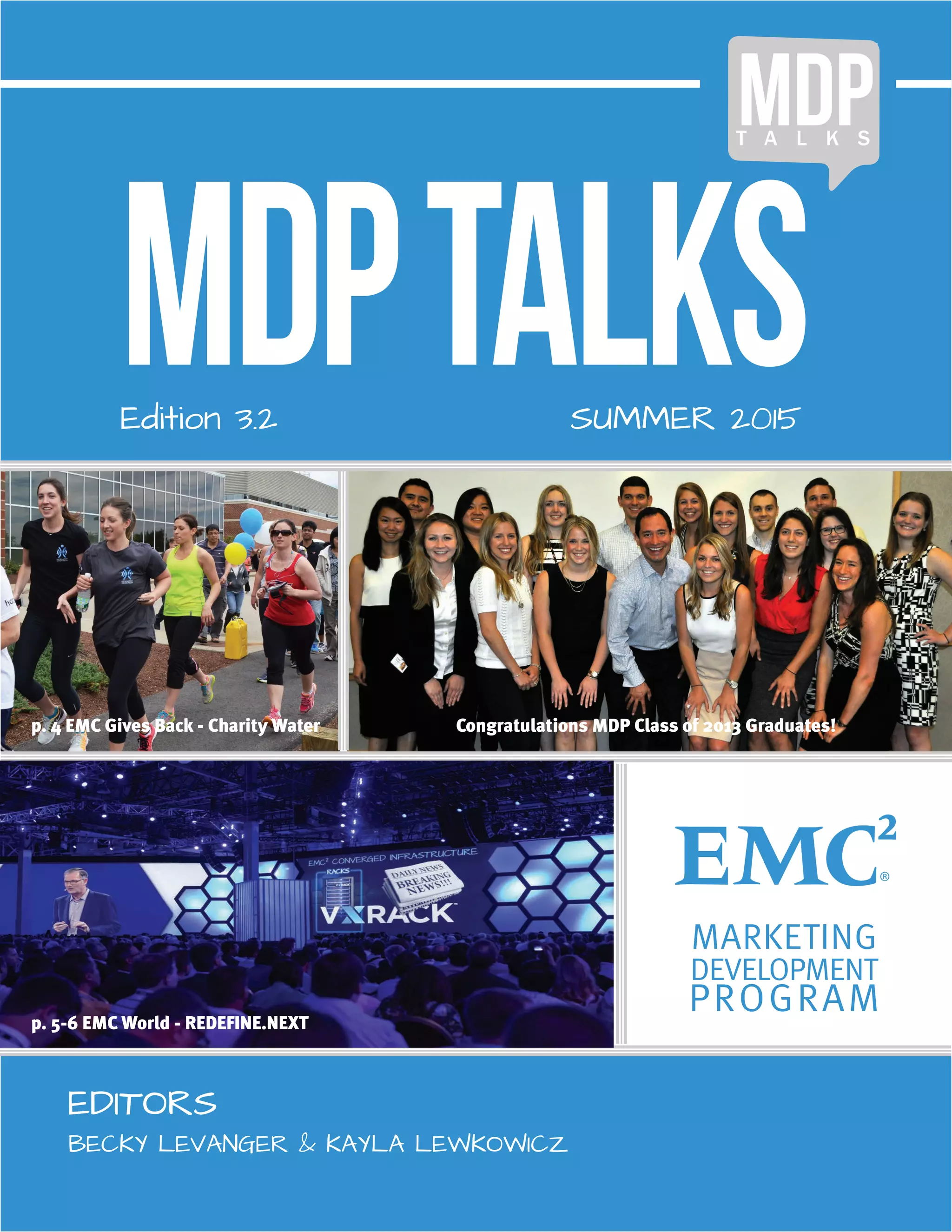 The document provides an overview of the Marketing Development Program (MDP) at EMC from 2003-2015. It discusses the origins and growth of the program over the years, highlights accomplishments of MDP classes and members, and recaps major EMC events where MDPers contributed including the Big Data launch, various product launches, EMC World, and charitable initiatives. It demonstrates the impact and value MDPers have brought to EMC through their work across various functions.