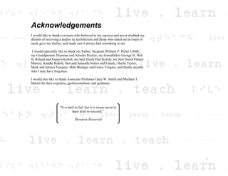 The document provides an overview of wayfinding and accessibility considerations for designing a school for the visually impaired. It discusses how wayfinding uses visual cues, lighting, colors, textures, and signage to guide those with impaired vision. Creating clear pathways, landmarks, and districts can help develop cognitive maps to aid navigation. The design of the school will focus on accessibility and exceeding ADA guidelines to create an inclusive environment that enhances independence for visually impaired students.
