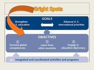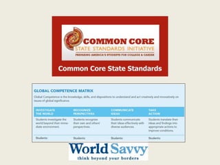 This document discusses using local resources to teach global lessons. It provides examples of local organizations, events, and communities that can help students learn about the world. These include sister cities programs, international festivals, campus events, local businesses with global connections, and interacting with diverse members of the local community. The document argues that aligning global competence standards with common core standards can help students investigate and understand other cultures and perspectives through lessons grounded in local experiences.