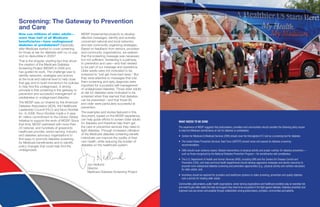 This document discusses the Medicare Diabetes Screening Project (MDSP), a national coalition founded in 2006 to promote diabetes screening among Medicare beneficiaries. It aimed to encourage seniors at high risk for diabetes to utilize their free annual diabetes screening benefit. The MDSP partnered with over 20 national organizations and hundreds of local groups to conduct community pilots, develop educational resources, and test strategies to increase screening rates. Over time, the MDSP expanded its focus beyond just screening to also emphasize diabetes prevention. The goals were to help seniors receive needed care or preventive services to fight diabetes and reduce the associated burden.