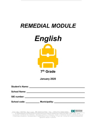 The Puerto Rico Department of Education provides this remedial English module for 7th grade students. The module contains multiple choice exercises to help students improve their English skills. It addresses areas where students need additional support in order to progress in their English class. The department will record students' participation and scores on the exercises, which will be added to their grades and academic reports. The goal is to help students achieve satisfaction upon completing the 7th grade.