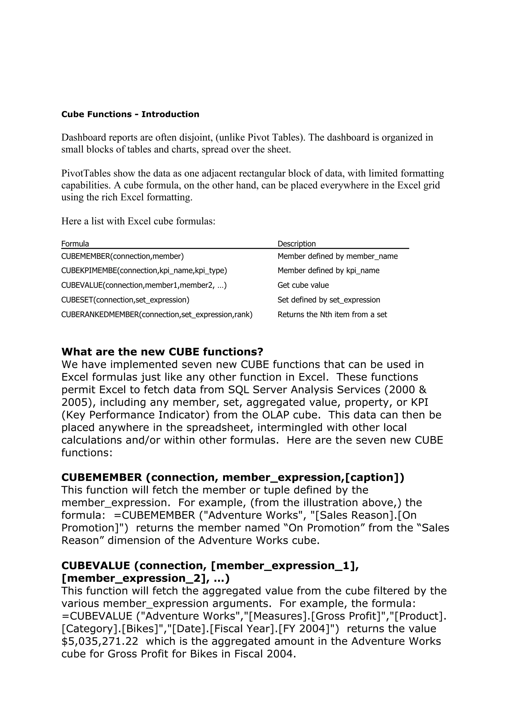 The document introduces cube functions in Excel that allow users to fetch data from OLAP cubes. It describes 7 new CUBE functions, including CUBEMEMBER to fetch members, CUBEVALUE to fetch aggregated values, and CUBESET to fetch sets. It also discusses how formula auto-complete helps users navigate OLAP cube hierarchies and provides examples of converting PivotTables to formulas using CUBE functions.