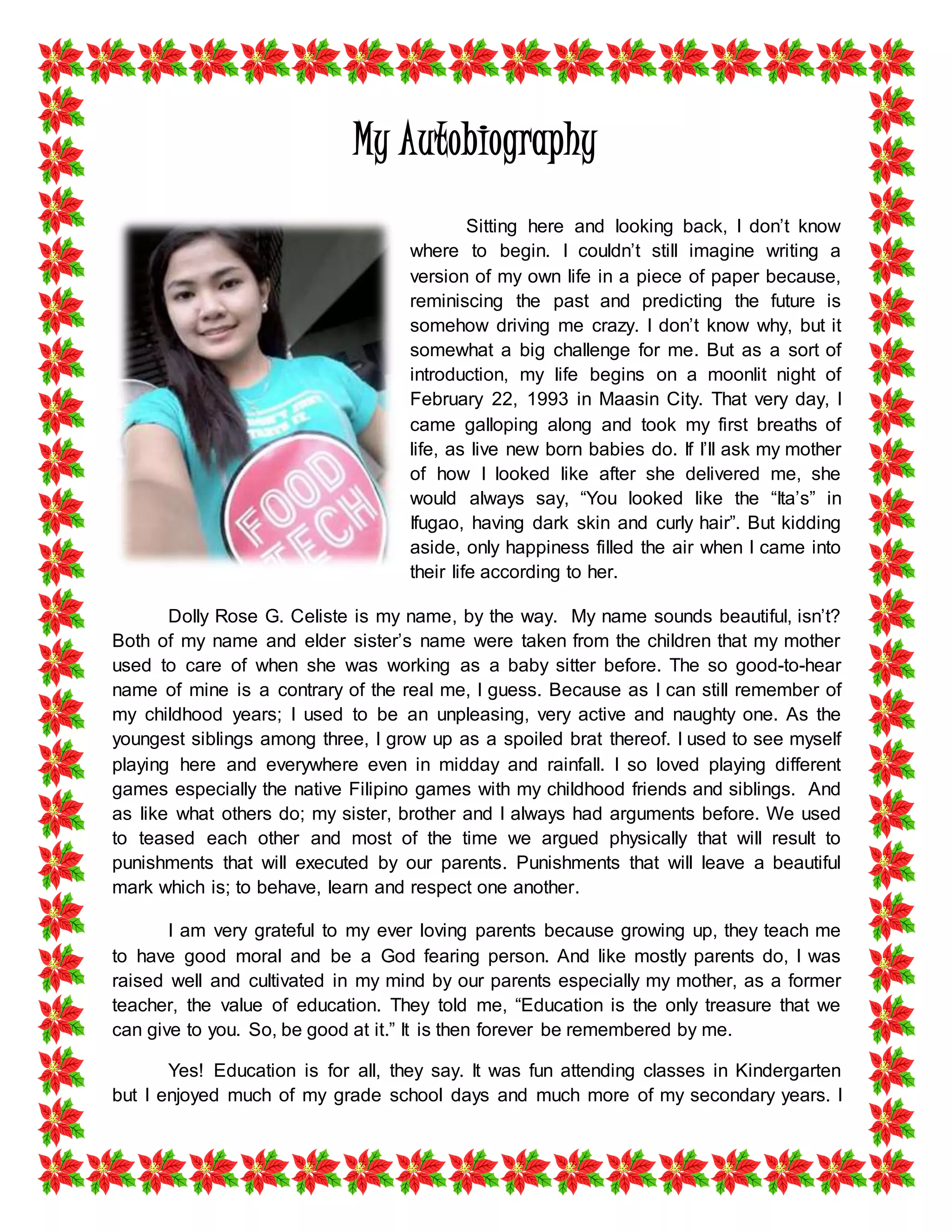 Dolly Rose G. Celiste was born on February 22, 1993 in Maasin City, Philippines. She grew up as the youngest of three children, spoiled but also taught good morals by her parents. She did well in school but had to stop her education to work after high school to support her family. She spent several difficult years working in Manila, learning independence and strength. She then returned home to continue her college education in food technology and entrepreneurship, inspired to finish what she started. Her dreams are to provide a luxurious life for her family and to travel the world.
