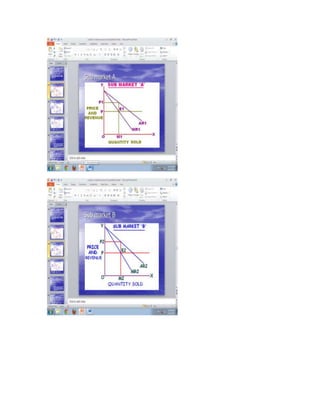 The document discusses different market structures and pricing strategies. It begins by defining a market and classifying markets based on competition. There are three main classifications discussed - perfect competition, imperfect competition (monopoly, oligopoly, monopolistic competition), and pure competition. The summary then discusses key aspects of each market structure, including price determination under different conditions. Pricing strategies like full cost pricing, product line pricing, and descriptive pricing approaches are also summarized at a high level.