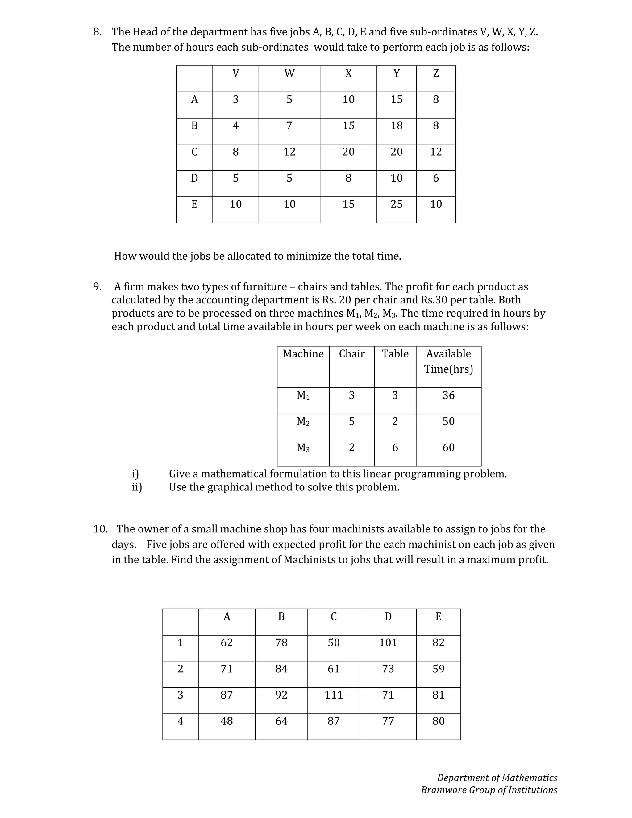 This document contains 13 questions related to linear programming problems (LPP). The questions cover various LPP solving techniques like graphical method, simplex method, Big M method and transportation/assignment problems. It also includes questions on project scheduling, queuing theory and their related performance measures.