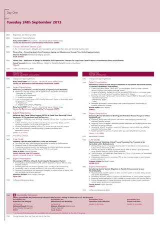 The document outlines the agenda for the PACE: Process and Critical Equipment Forum held in Dubai on September 24-25, 2013, focusing on optimizing asset performance through effective management of critical equipment and processes. It features keynote presentations and expert insights from industry leaders on topics such as maintenance strategies, lifecycle asset management, and process optimization techniques. The conference aims to equip professionals with the skills needed to enhance operational efficiency, improve reliability, and extend the lifecycle of critical assets in various industries.