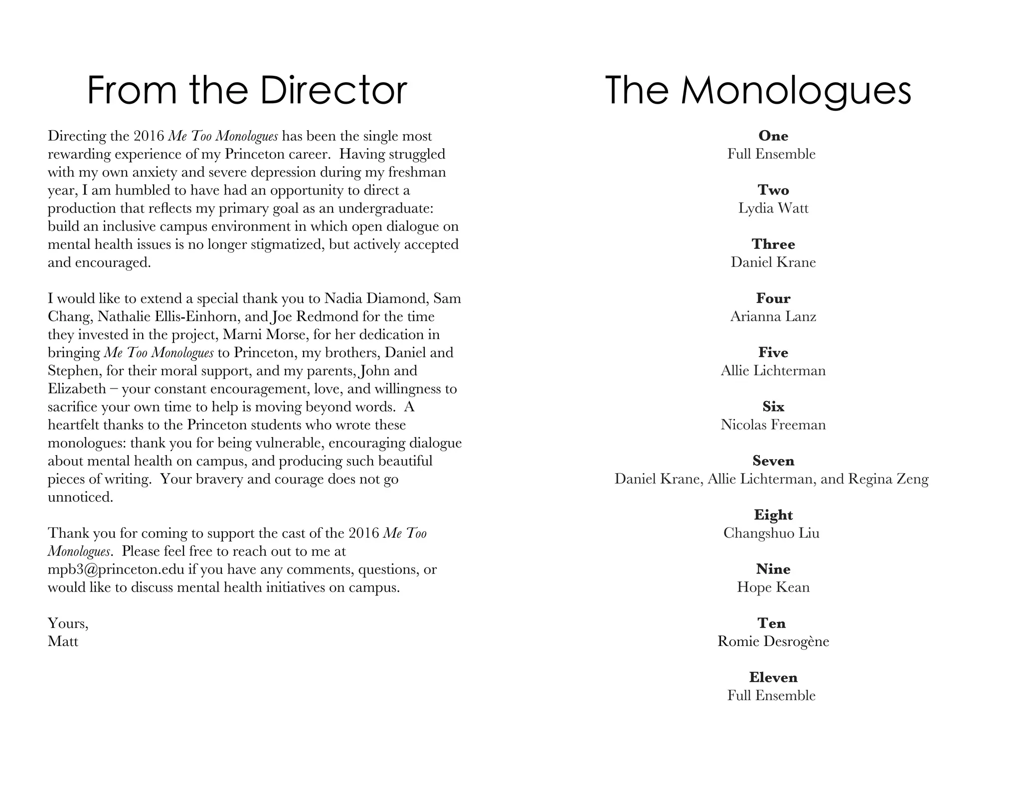 The document summarizes a performance of "Me Too Monologues" at Princeton University that aimed to encourage discussion of mental health issues. It describes how students anonymously submitted personal monologues about their mental health experiences, which were then selected, edited and performed by actors. The production was directed by a Princeton senior and intended to help reduce the stigma around mental health so students feel comfortable seeking help.