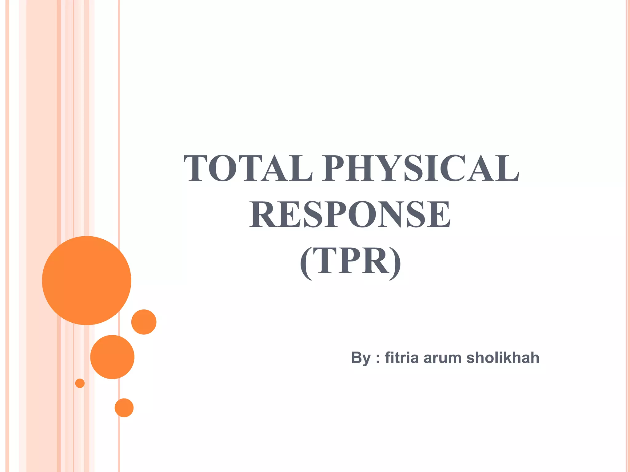 Total Physical Response (TPR) is a language teaching method developed by James Asher that uses physical actions in response to verbal commands to teach language comprehension before speaking. It is based on theories that language learning is most successful when it mirrors natural child development of listening before speaking, involves the right brain, and reduces stress. In a TPR classroom, the teacher decides on vocabulary and grammar to present through imperative drills while students physically respond, with little student influence over content. The method aims to produce learners who can communicate orally with native speakers.