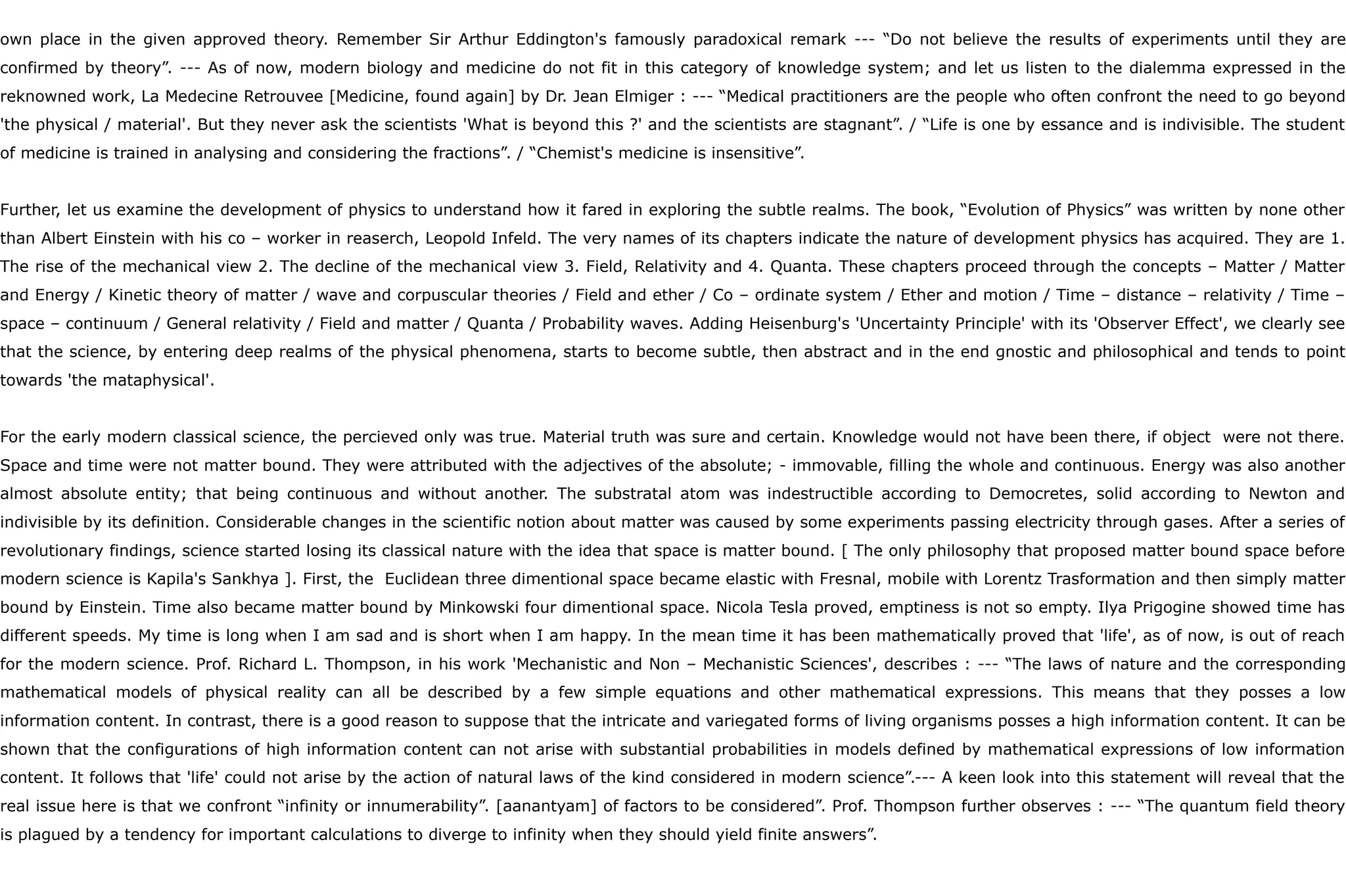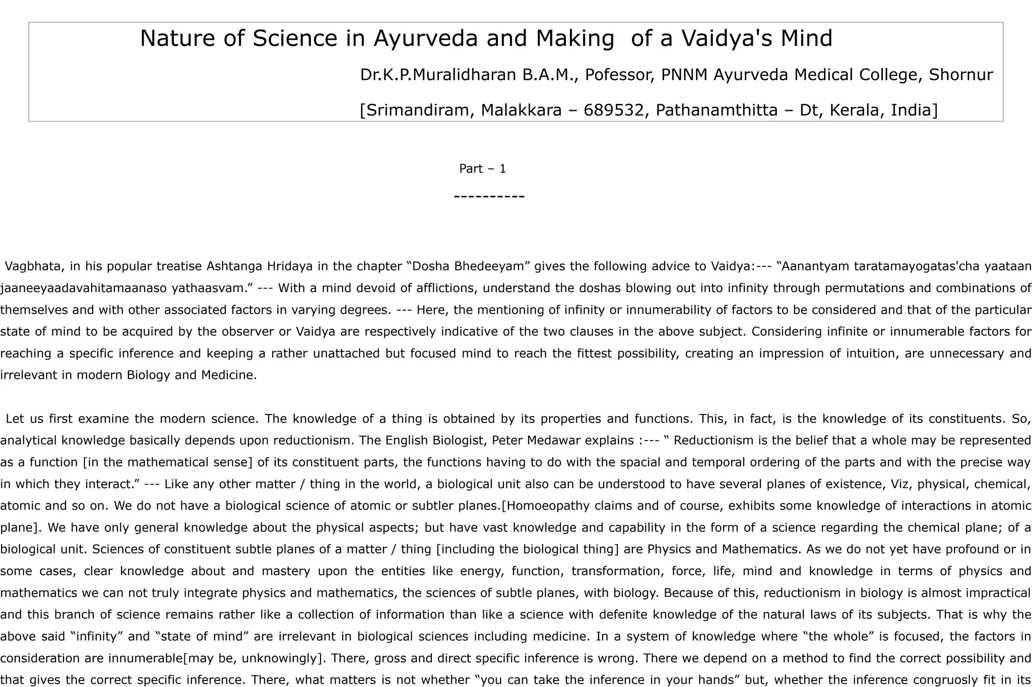This document discusses the nature of science in Ayurveda and the development of a physician's mindset. It argues that Ayurveda considers infinite factors and aims for the most appropriate inference, unlike modern biology which focuses on reductionism. The document also examines how physics has moved from a classical mechanical view to incorporating field theory, relativity, and quantum mechanics. This progression reveals physics approaching metaphysical concepts. Similarly, Ayurveda views all matter as constituted by universal factors of properties, functions, and knowledge, allowing for integration of the physical and metaphysical.