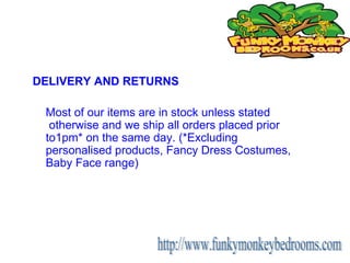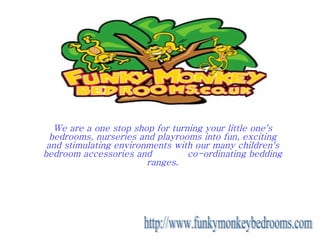 Funky Monkey Bedrooms is a one-stop shop that turns children's bedrooms into fun environments through accessories and coordinating bedding. Most in-stock items are shipped the same day for orders placed before 1 pm, excluding some personalized products. They offer kids costumes and bedroom items for boys and girls, and can be contacted at their Kent address or by phone and email.