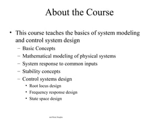 The document outlines a control engineering course covering system modeling and control system design, including topics like mathematical modeling, stability concepts, and design methodologies such as root locus and state-space design. It highlights the differences between open-loop and closed-loop systems, discussing advantages like improved accuracy and flexibility through feedback, as well as drawbacks like increased complexity and cost. The document also touches on historical advancements in control systems and their applications in various fields.