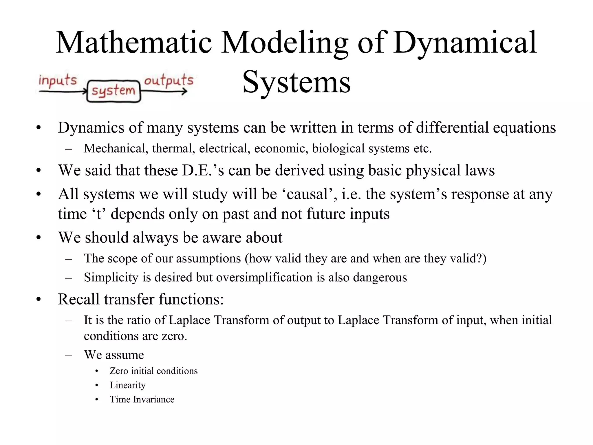The document discusses the modeling of dynamical systems in control engineering, emphasizing the use of differential equations across various fields such as mechanical and electrical systems. It illustrates the similarities between electrical and mechanical components, including the translation of concepts like impedance and transfer functions. Additionally, it covers the complexities of multi-loop circuits and analogies in mechanical systems, stating that both can be analyzed using similar methods and equations.