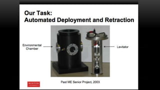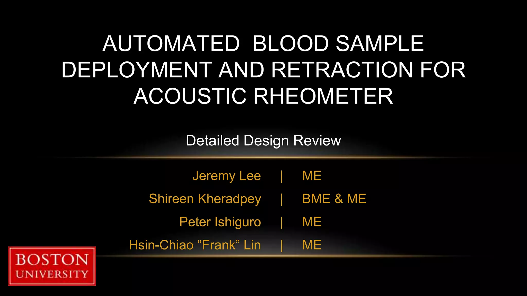 The document proposes an automated blood sample deployment and retraction device for acoustic rheometry. It discusses current solutions for blood coagulation analysis and their limitations. The proposed device aims to automatically deploy a 0.03 mL blood sample into an acoustic levitation field with minimal contamination or handling. Design requirements include accurately dispensing the target volume, minimizing acoustic invasiveness, and automating the sample deployment process. Several design concepts and a preliminary design are presented and evaluated. A final design is selected consisting of a syringe-based deployment system and a rack-and-pinion driven entry/exit system. Testing shows the design can deploy volumes within the target range.