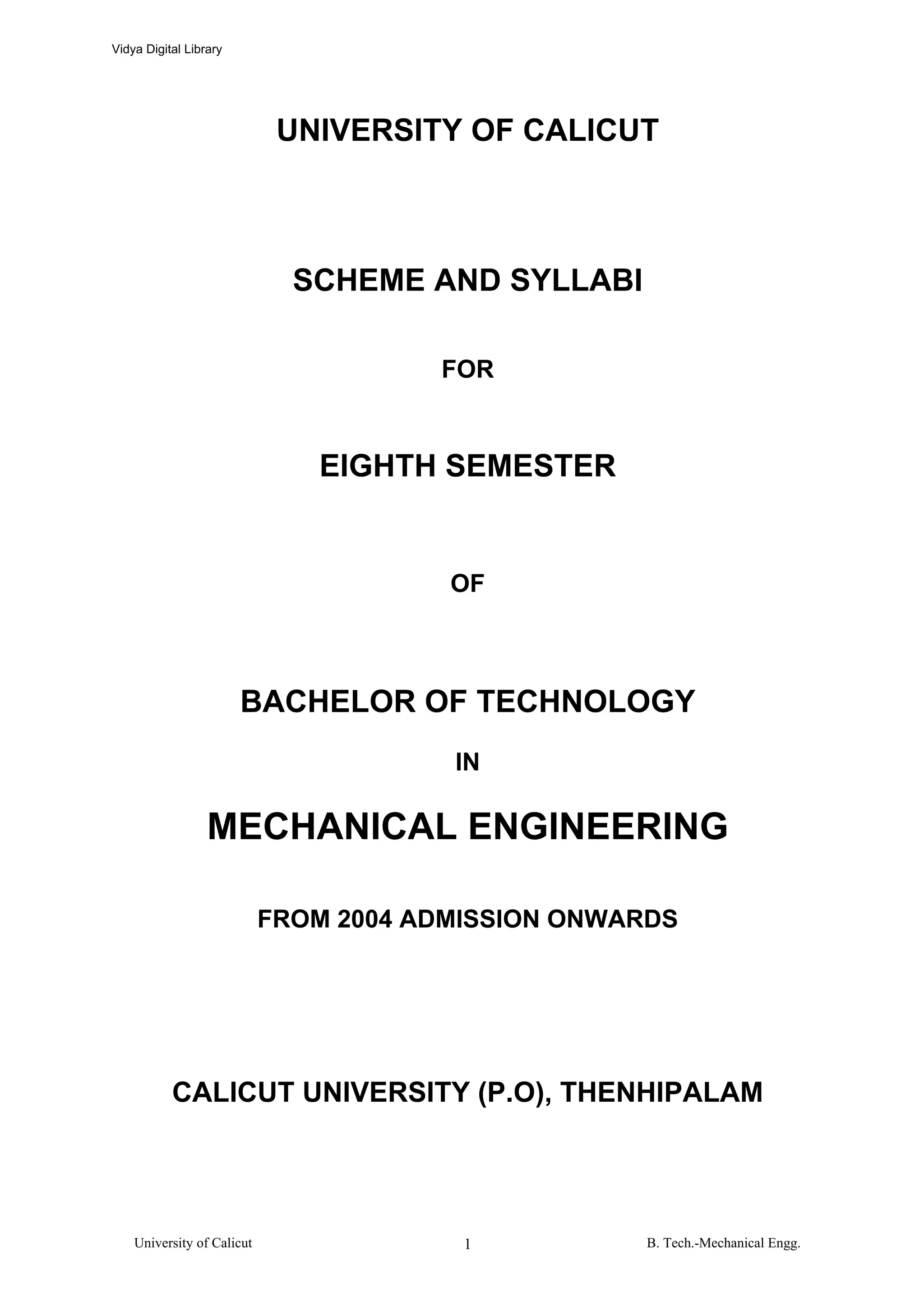 This document outlines the syllabus for the 8th semester of the Bachelor of Technology program in Mechanical Engineering at the University of Calicut. It includes details on 8 subjects to be covered: Quality Engineering and Management, Operations Management, Mechatronics and Machine Controls, two elective subjects, a seminar, project work, and viva voce. For each subject, it provides the course objectives, topics to be covered in each module, textbook references, and exam format. The semester aims to impart knowledge in areas such as quality management, statistical process control, operations research techniques, production planning, facilities planning, and a major project.