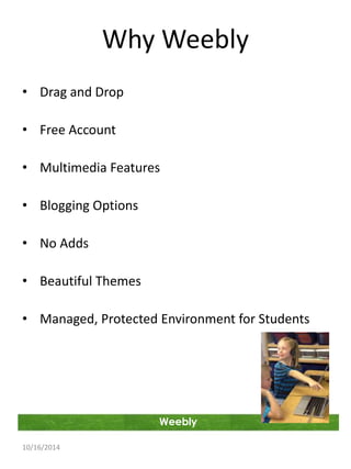 This document provides an overview of the Weebly website building tool and how to use it. It discusses why Weebly is a good option for educators, how to get started building a website, choosing a theme, adding pages and elements, publishing the site, and managing students. Key features of Weebly highlighted are the drag and drop interface, free accounts, multimedia integration, and secure environment for student sites.