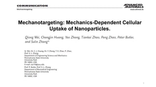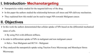 This study examined how the mechanical state of cells affects their uptake of nanoparticles (NPs). Experiments showed that cellular uptake of NPs decreased with increasing cell stress, counteracting the effect of increased surface area from cell spreading. Malignant cancer cells undergoing metastatic transition on stiff substrates dispersed into low-stress, unspread cells with higher NP uptake compared to non-malignant cells. This mechanical targeting approach could potentially deliver higher payloads of drugs to metastatic cancer cells.