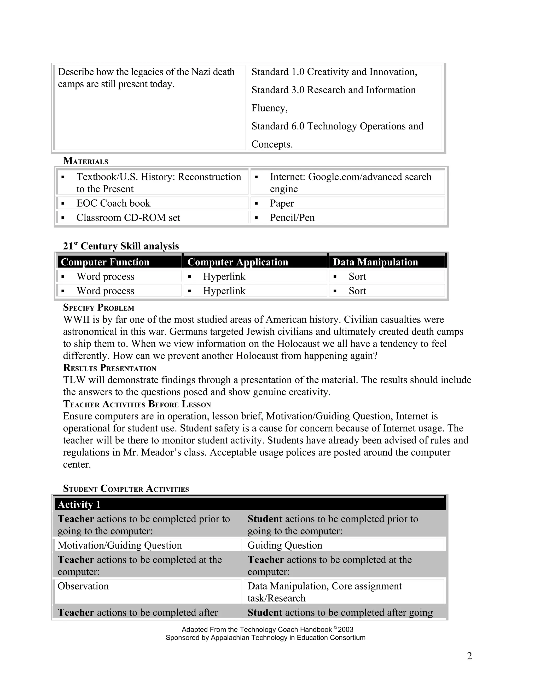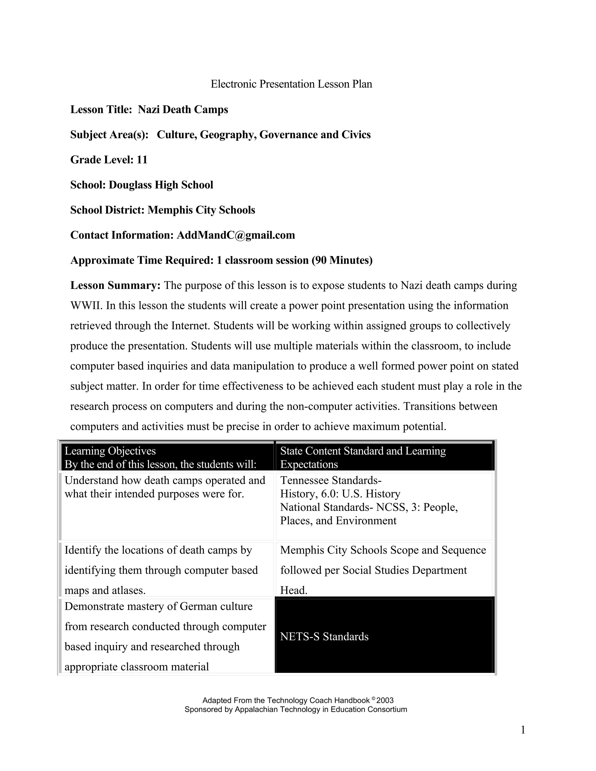This lesson plan involves students researching Nazi death camps through creating a PowerPoint presentation in assigned groups. Students will use computers and classroom materials to research the locations and operations of death camps, and how their legacies continue today. The goal is for students to understand how death camps functioned and their intended purpose of targeting Jewish civilians. Students will be monitored during computer research and assessed on their presentations through a rubric.