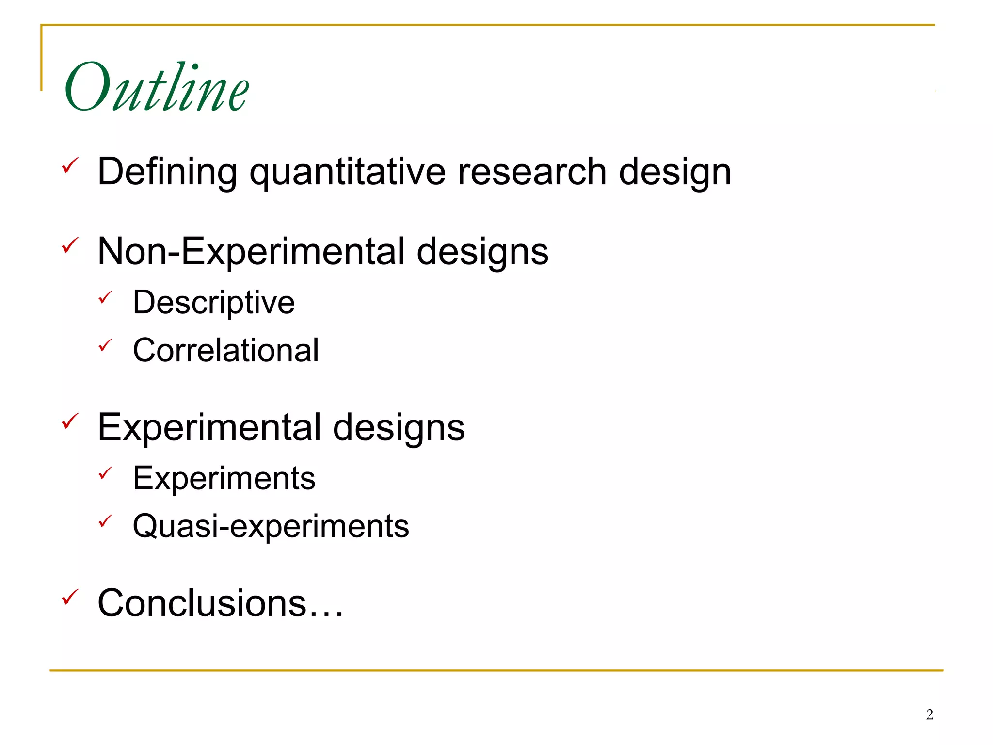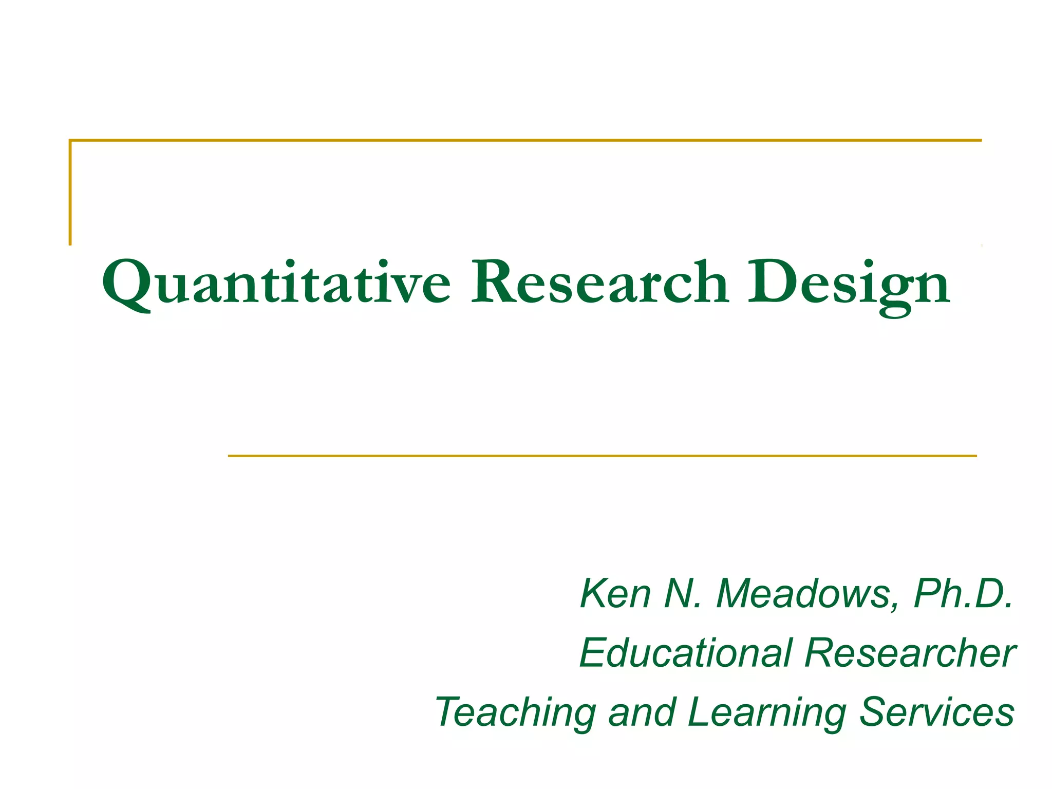 This document provides an overview of quantitative research design. It defines key terms and discusses the differences between experimental and non-experimental designs. Non-experimental designs include descriptive and correlational methods. Experimental designs manipulate a variable to measure its effect and can be true experiments or quasi-experiments. The document provides examples and discusses threats to validity.