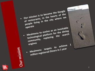 This document outlines how restaurants can register with MealMenu to increase their online orders and footfall. Restaurants agree to recognize orders made through MealMenu's website or app. They have the option to subscribe for additional benefits like ads, deals and discounted online orders. Alternatively, restaurants can get listed on MealMenu for free and see increased online visibility. Restaurants need to have an internet-connected device and operator to process online orders, or they can integrate their existing online ordering system. As a last option, MealMenu will check orders and direct them to the restaurant's kitchen.