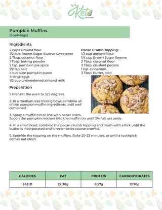 The document provides a week's worth of recipes organized by meal: breakfast, lunch, snacks, dinner and desserts. The recipes include pumpkin muffins, turkey meatloaf muffins, air fryer brussel sprouts, and cauliflower and celeriac soup among others. Nutritional information is provided for each recipe, including calories, fat, protein and carbohydrates.