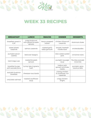 This document provides a week's worth of recipe ideas organized by meal (breakfast, lunch, snacks, dinner, desserts). It includes over 30 recipe titles and ingredients for items like breakfast cereal in a jar, crispy bratwurst with glazed brussels sprouts, salmon casserole, pumpkin pecan cookies, kale and egg cups, and chocolate oatmeal. The recipes offer a variety of primal/paleo, whole30 compliant meals and snacks for a full week of meals and desserts.