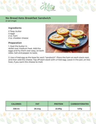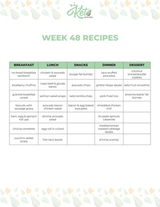 This document provides a week's worth of recipes organized by meal: breakfast, lunch, snacks, dinner and dessert. The breakfast section includes recipes like no bread breakfast sandwiches, blueberry muffins, granola cereal and biscuits with sausage gravy. The lunch section features recipes such as ham, egg and spinach roll ups, chorizo omelette and zucchini skillet strata. Snack recipes include items like chicken and avocado salad, roast beef and gouda bento boxes. Dinner recipes provided are salmon salad wraps, shrimp avocado salad and egg roll in a bowl. Desserts listed are coconut fat bombs and chocolate brownie batter fat bombs.